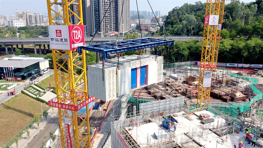 龙华樟坑径地块项目采用中建海龙科技研发的装配式4.0核心建造技术,将建筑整体拆分为独立空间单元,每个空间单元的结构、装修、机电、给排水与暖通等90%以上的元素在工厂内完成,施工现场仅需完成地基处理、结构框架搭建、单元吊装、管线接驳等少量工序,把每个单元像“搭积木”一样精细化组装,即可完成项目建设,使得原本需要3-4年完成的百米高住宅建筑项目,在一年内可完成建设,相较传统建筑模式工期减少60%以上。