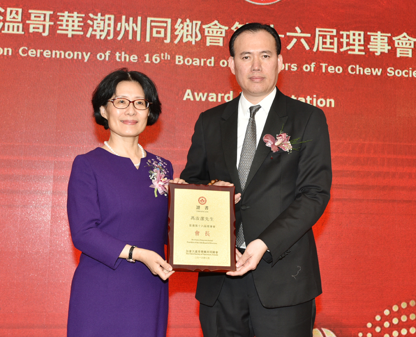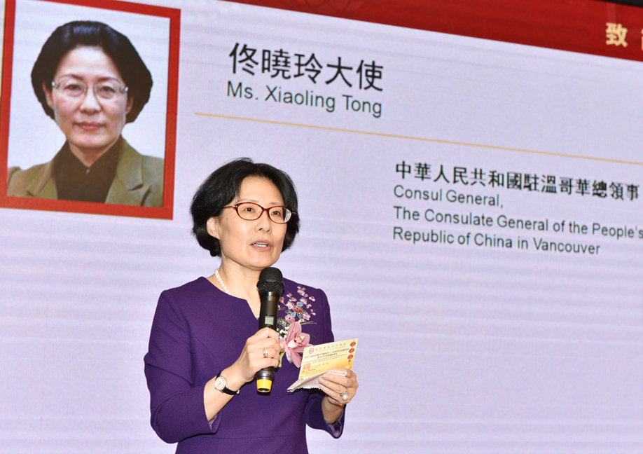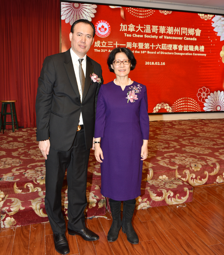 佟曉玲總領事代表總領館對潮州同鄉會表示新春祝賀,她祝賀新一屆理事就職,高度讚賞潮州鄉親們在同鄉會的帶領下,為建設加拿大,回饋祖籍國和家鄉所做出的貢獻。她強調華人早在加拿大建國前就來到這片土地,在加拿大建國及發展各個階段均做出了巨大貢獻,也促進了加拿大多元文化融合。今年是中加旅遊年年,特魯多總理、BC省長賀瑾近期都先後訪華,讓我們一起努力,為促進中加兩國人民的友誼、促進兩國經貿文化科技交往多做貢獻。