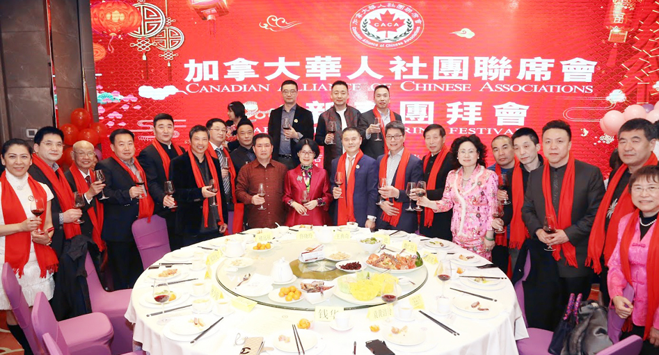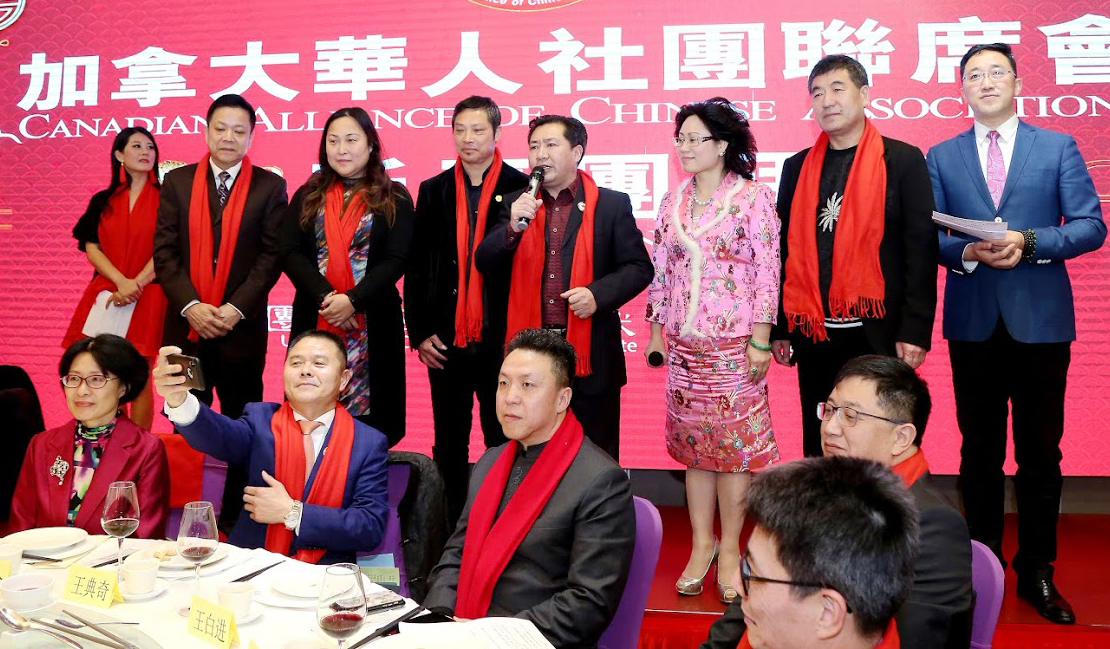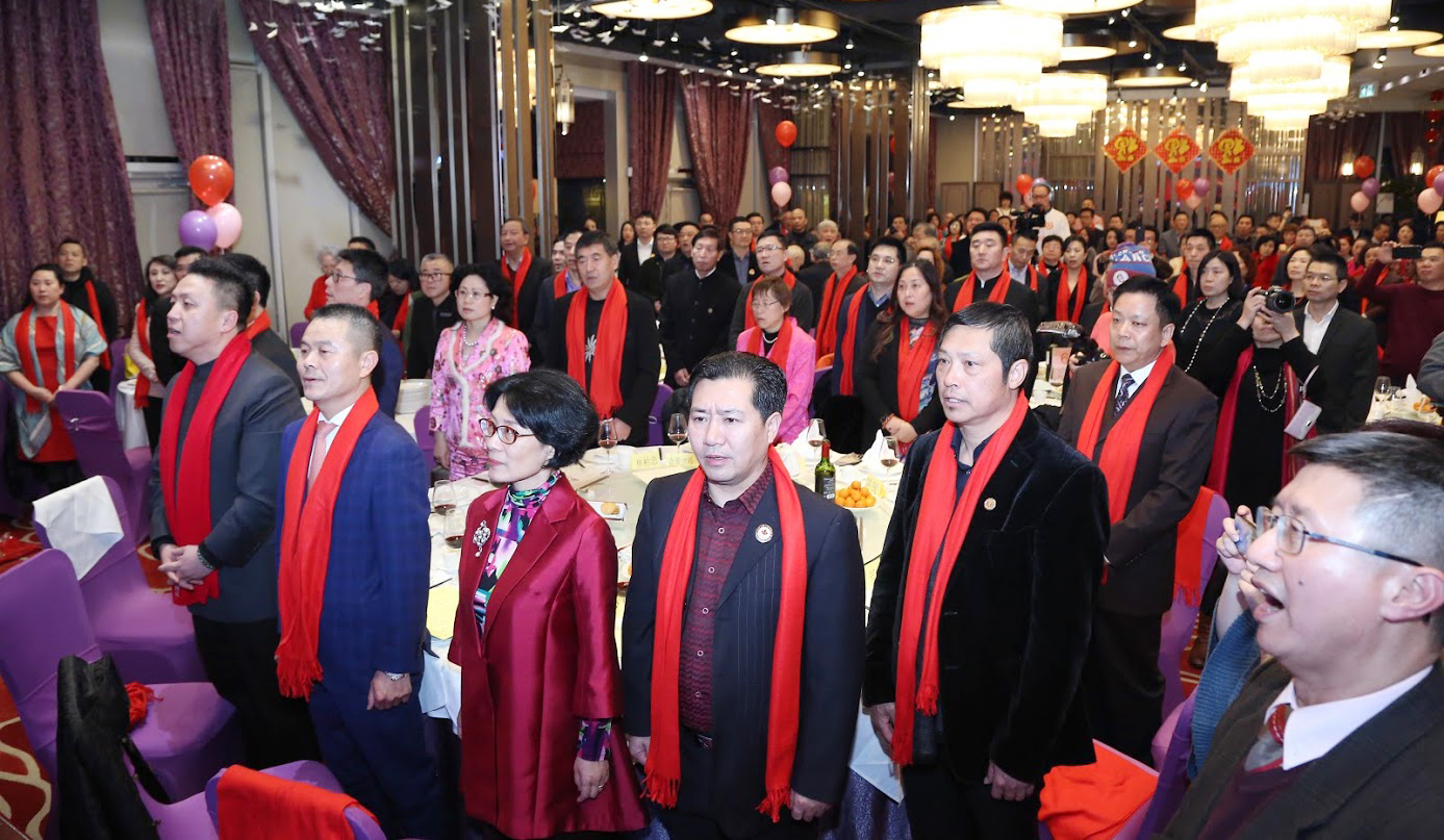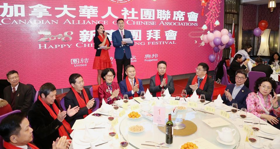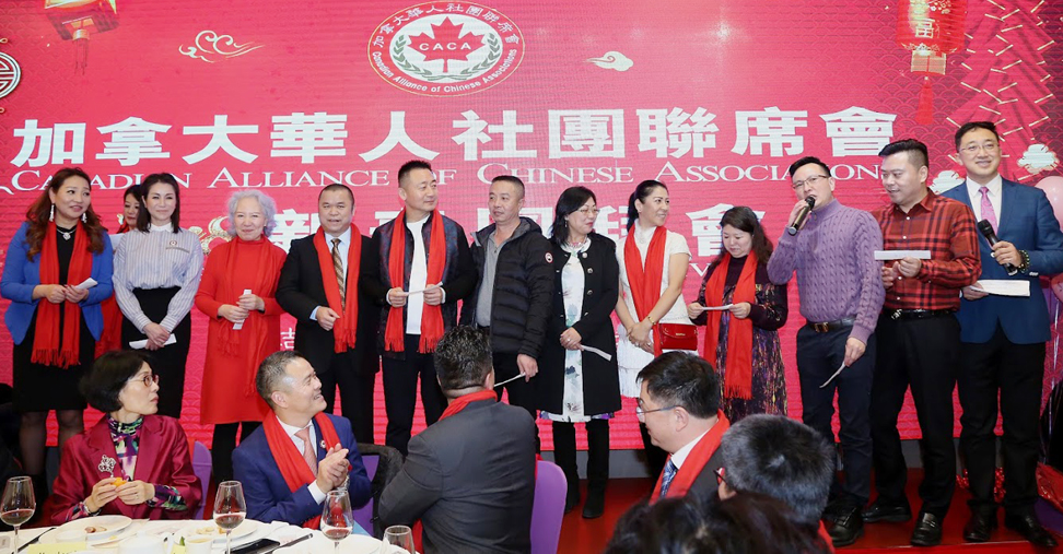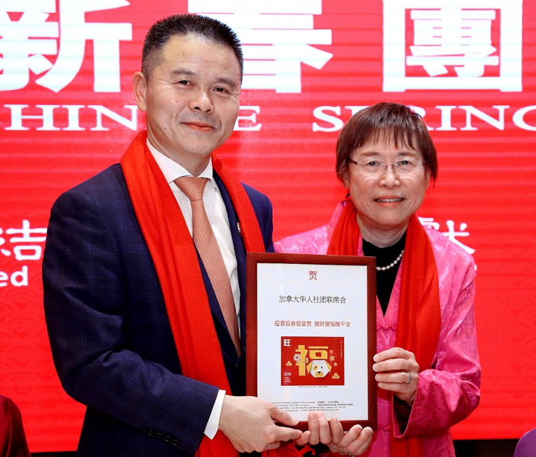 当晚,宴会大厅暖意融融、与会嘉宾笑语欢声。喜庆热烈的团拜会由温哥华金牌主持吴彤和吴瑾主持,著名歌手陈拾宽领唱加中两国国歌。