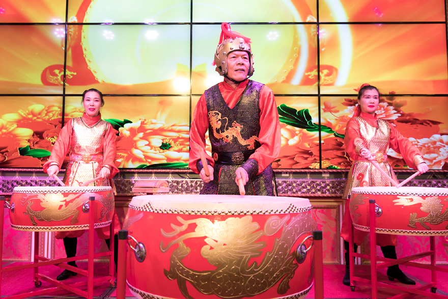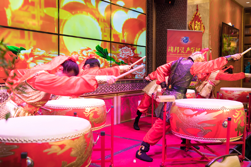 庆典开始十数面大鼓一齐擂响,鼓声震天,气势磅礴。