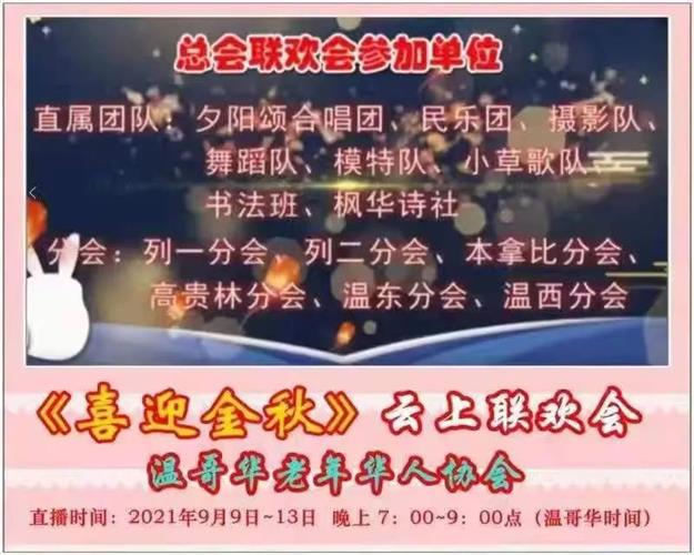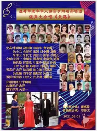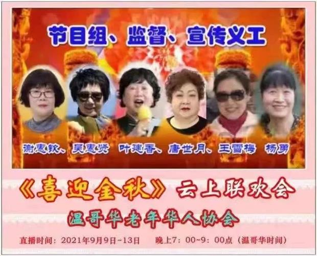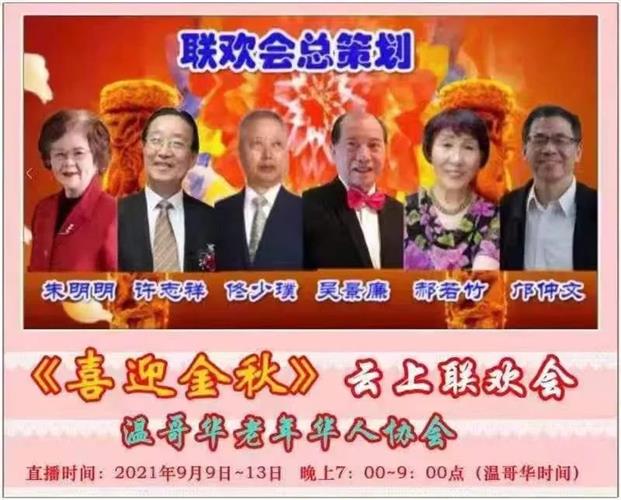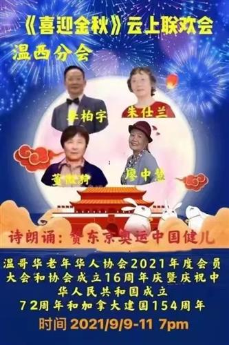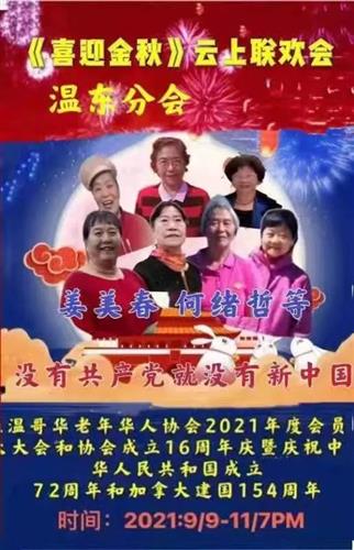 温哥华老年华人协会 2021年9月9日在网上举办《喜迎金秋》聯欢會。以庆祝协会成立16周年暨本年度会员大会,庆祝加拿大建国154周年,庆祝中华人民共和国成立72周年。