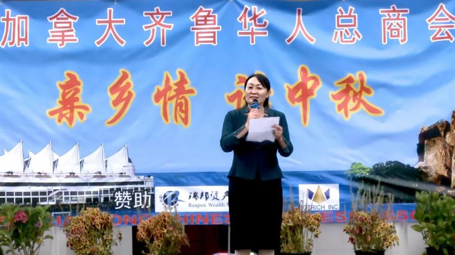 首先,齐鲁商会会长郑燕女士致欢迎词。她在致辞中热烈地欢迎各界人士的到来,她说齐鲁商会是一个山东人及各地朋友交流的平台,多次举行了商务洽谈和文化交流活动。山东人也在本地深入社区,默默做着各种奉献,像在疫情期间给中加两国人民的捐助,在BC省Lytton火灾中的捐献,体现了真情大爱。在历次选举中,齐鲁人也是积极的支持和推动者,捐款做义工,体现了参与社区的建设和发展。她特别感谢了山东人的爱心,这也是“亲乡情话中秋”的意义所在。