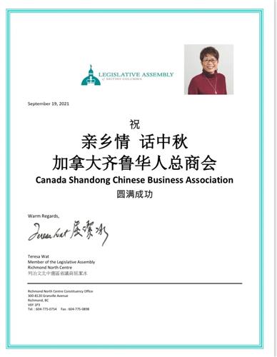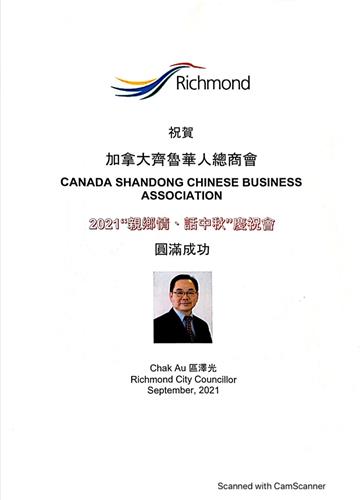 2021年9月19日下午,加拿大齐鲁华人总商会(以下简称齐鲁商会)在大温哥华地区列治文市举行商会的传统项目“亲乡情话中秋”活动。在温哥华的山东父老乡亲、商会理事会成员及山东人的亲朋好友参与了此次活动。