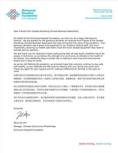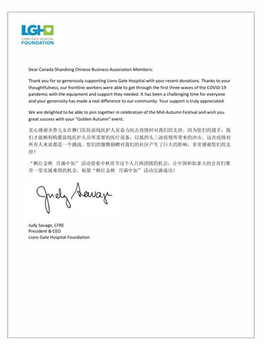 接受捐赠的红十字会代表Mr.Karar、Ms.May和本拿比医院基金会的财务总监Ms.Claire Wang特意赶到现场,他们由衷地对山东人的慷慨捐赠表达了感谢,并送上了感谢状和贺信。他们在致辞中表达到,无论疫情还是火灾,齐鲁商会及齐鲁儿女都在第一时间送上了捐款,带来了感动和温暖。他们的款都被用在了那些急需的地方,像本拿比医院购进的抗疫检测和治疗设备上等。温哥华总医院、狮门医院、列治文医院基金会的负责人因事无法到场,也都纷纷发来了感谢状和贺信。