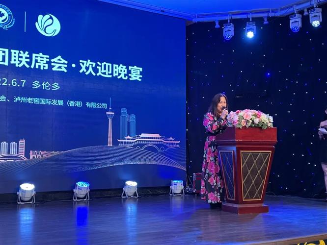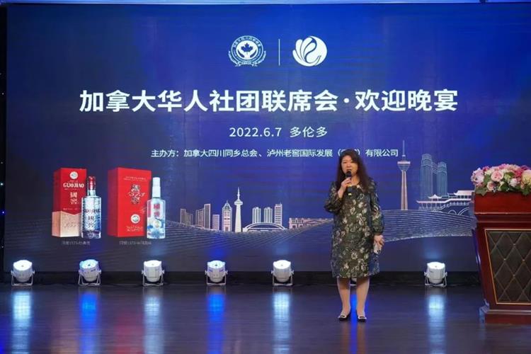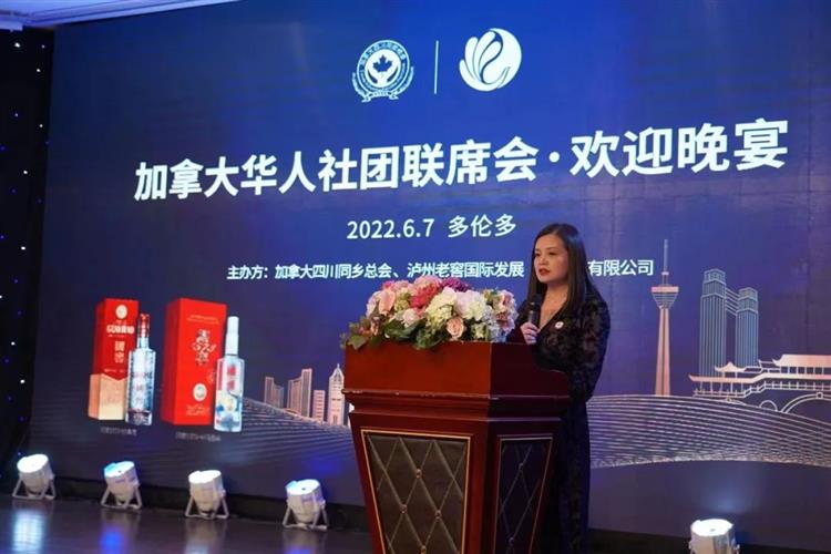 7日晚,加拿大四川同乡总会和泸州老窖国际发展(香港)有限公司联合举办晚宴,欢迎联席会旅行团到访东部。四川同乡总会会长、泸州老窖加拿大总代表杨莎发表了热情洋溢的欢迎词,欢迎大家到多伦多来,她介绍了四川同乡总会的发展和泸州老窖十一年来在加拿大逐步拓展过程,她感谢社会各界对四川同乡会的关爱和支持,她感谢联席会和社会各界对泸州老窖的情有独钟与厚爱,经过多年开拓,已经在全球超过60个国家和地区建立了销售,成为海外能见度最高、分布最广、最受欢迎的最广中国白酒品牌之一。她最后说,希望今天的晚宴能为大家带来回味无穷的体验,我们将以最美的酒、最真的情来报答大家的信任和厚爱。