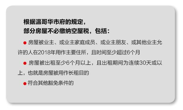 温市府网站明确表示,温哥华空屋税在某些情况下是可以豁免的,其中一项就是居住者被护理。如果房屋超过6个月无人居住,原因是居住者、租客或转租后的租客在接受医疗护理或居住于医院、长期或支持性护理机构,那么这种情况是可以豁免空屋税的。