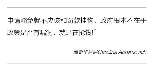 Abramovich打电话到温哥华市府想要上诉。然而对方却告知她,必须要先支付罚款,才有资格递交延迟申报的申请。Abramovich气愤的说:“申请豁免就不应该和罚款挂钩,政府根本不在乎政策是否有漏洞,就是在抢钱!”