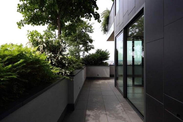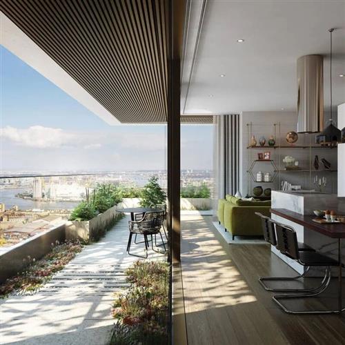 顶层公寓上下层之间设有量身定制的楼梯,落地窗可让你最大程度饱览城市景观,细密的条木雨篷将露台空间与自然相融合。