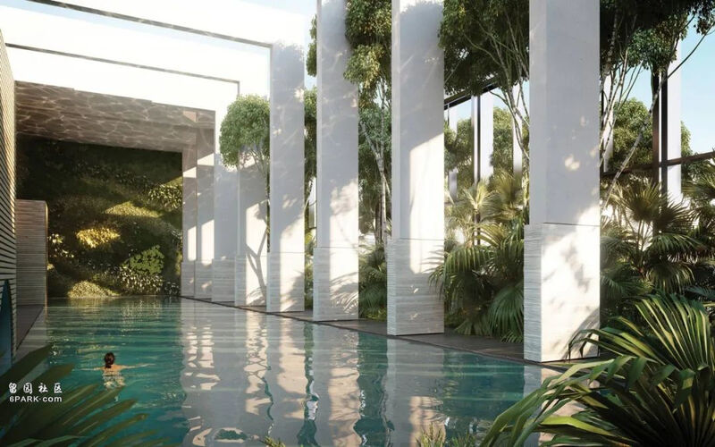 长 25 米的露天泳池也被绿植环抱,白色廊柱切分出立体而简洁的景观视野。