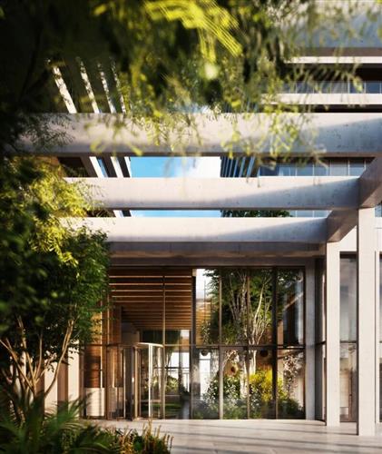 从接近大楼入口的那一刻,目之所及即是各种各样的绿色植物:在连接两栋塔楼的公共广场上有一个种植着逾 100 种树木与花卉的小型植物园;