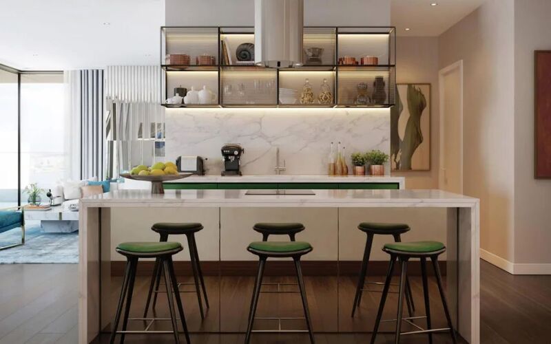 开放式厨房装有玻璃橱柜,与大厅的玻璃花园主题相呼应。大理石台面加上漆成绿色的柜面、吧台凳,有机的纹理和色泽像是一副艺术品。