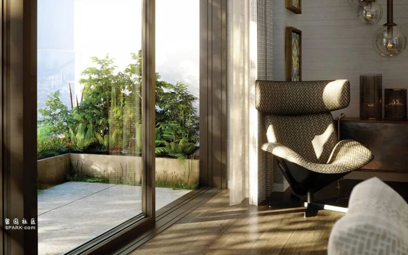 双层高开放露台是只有顶层公寓才有的配套,更适合栽种大型乔木。打开门,整片私人花园成为住宅的延伸。这样的尺度具有及其高挑的空间感。