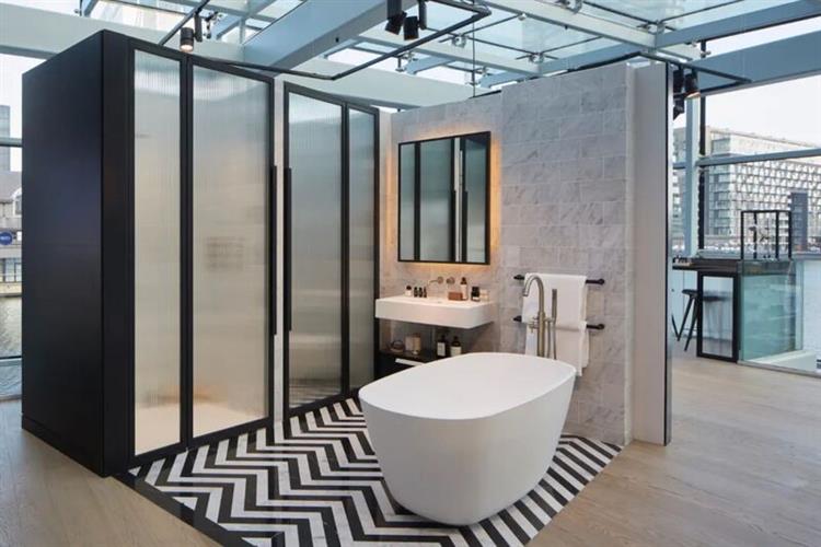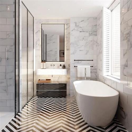 浴室以白色为主基调,地面铺贴经典的黑白几何瓷砖,墙面大理石纹理细腻。