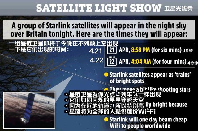预计4月23日凌晨4:21,明亮的星链将由西往东北角划过,显示时间长度为4分钟;而在4月25日凌晨3:41,星链也将再次出现,从北向东北方向运行,显示时长为2分钟。