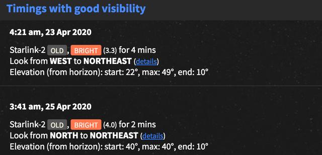 我们尝试了一下北京未来几天可以看到星链卫星的时间: