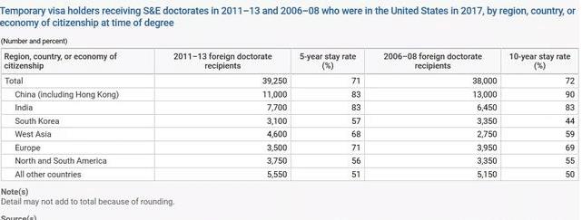 一个现象必须得承认,在过去的几十年里,中国的顶尖人才一直在被被美国吸血:从2019年美国政府发布的官方调查报告来看,中国高校生源在2011-2013年拿到博士学位后五年、仍留在美国的比例达到83%,而2006-2008年拿到博士学位后十年都留在美国的比例高达90%。