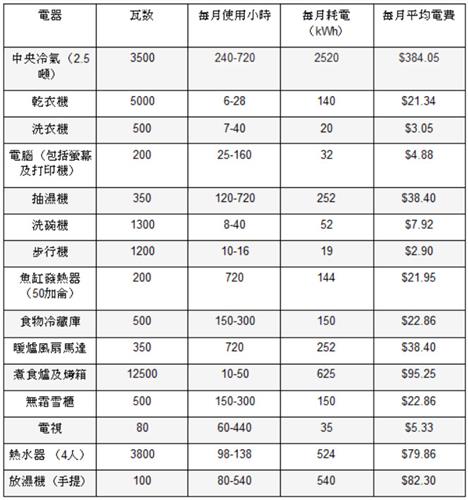 根据伯灵顿水电局的推算,以下是各种家用电器的每月电费 (以每千瓦时的电费是0.1524元来计算)。