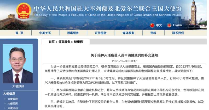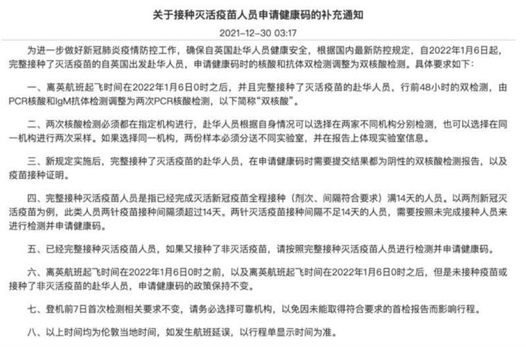 通知显示,为进一步做好新冠肺炎疫情防控工作,确保自英国赴华人员健康安全,根据国内最新防控规定,自2022年1月6日起,完整接种了灭活疫苗的自英国出发赴华人员,申请健康码时的核酸和抗体双检测调整为双核酸检测。具体要求如下: