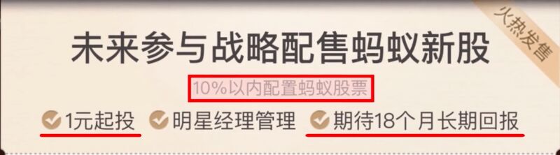 私人股东中,有马云的泰山会成员郭广昌、卢志强、史玉柱,还有李嘉诚和李开复。马云带着这些大大小小的神仙股东,想在监管到来之前,在证券市场上割最后一把韭菜。为了配合蚂蚁集团上市,支付宝独家代销了5只蚂蚁战略配售基金金,募资600亿元。很多人没有留意到一行灰色字体:10%以内配置蚂蚁股票。这意味着你想参与蚂蚁股票的配售,你得花90%的冤枉钱,捆绑购买其它股票。