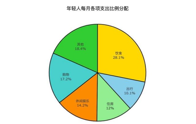 按照调查数据,这届年轻人每月支出的大头在饮食方面,高达28.1%,另外购物占每月开支的17.2%,休闲娱乐支出占比14.2%。