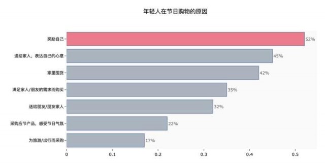 通过对年轻人在节日购物的原因的调查发现,“买买买”已经是满足年轻人社交分享、表达快乐和情感的重要方式。