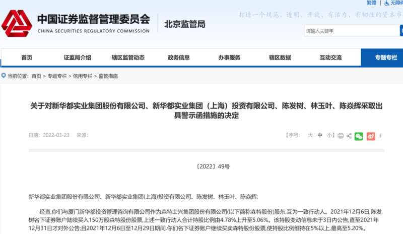 据央视财经报道,北京证监局近日发布了《关于对新华都实业集团股份有限公司、新华都实业集团(上海)投资有限公司、陈发树、林玉叶、陈焱辉采取出具警示函措施的决定》。