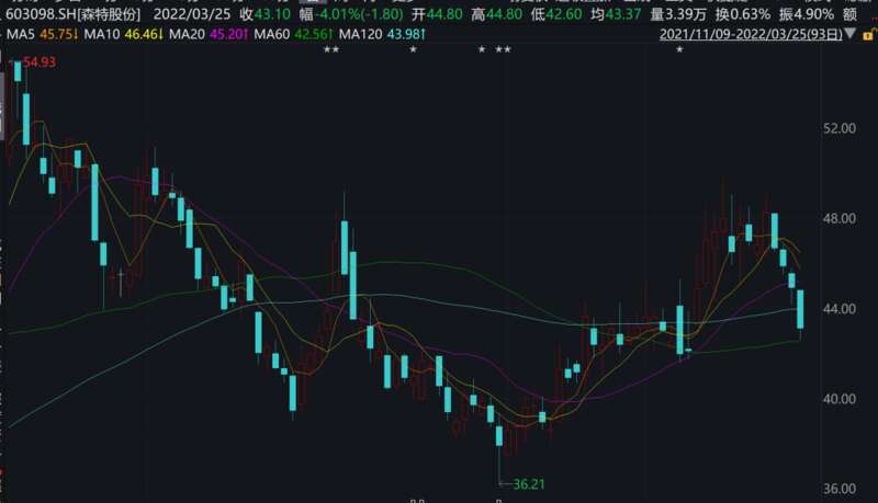 截至3月25日收盘,森特股份收报43.10元/股,跌4.01%。