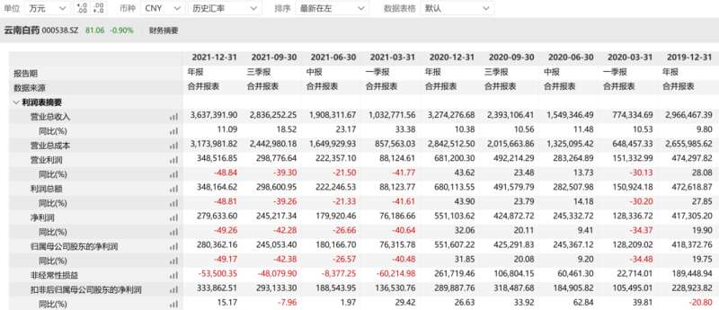 因合并,云南白药账面资金暴涨百亿,再加上陈发树的加持,云南白药在投资领域愈加发力。然而“股神”也有折戟时。3月25日晚间,云南白药公布2021年业绩报告。2021年,云南白药实现营业收入363.74亿元,同比增长11.09%;实现归属于上市公司股东的净利润为28.04亿元,同比下降49.17%。