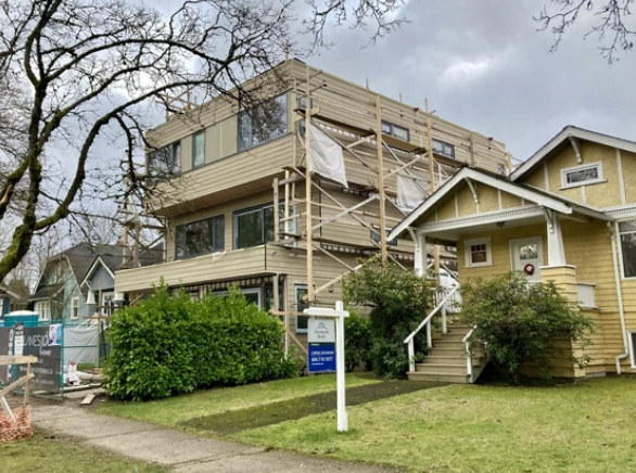 事情要从2023年9月说起。当时,温哥华市长沈观健(Ken Sim)联合市议会左右中各派,一致推动所谓的“缺失中间层住房”(missing middle)政策,鼓励开发商在单户住宅用地上建设 4 到 6 户的多单元住宅,目的是快速提高城市密度、缓解住房短缺。