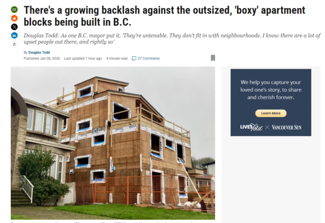 在专业人士看来,问题并不完全在“多户住宅”本身。规划顾问、退休建筑师 Michael Geller 表示,多单元住宅这种形式其实并不差,他自己也做过很多。但他认为,现在街头冒出来的很多新项目,确实又丑又方。