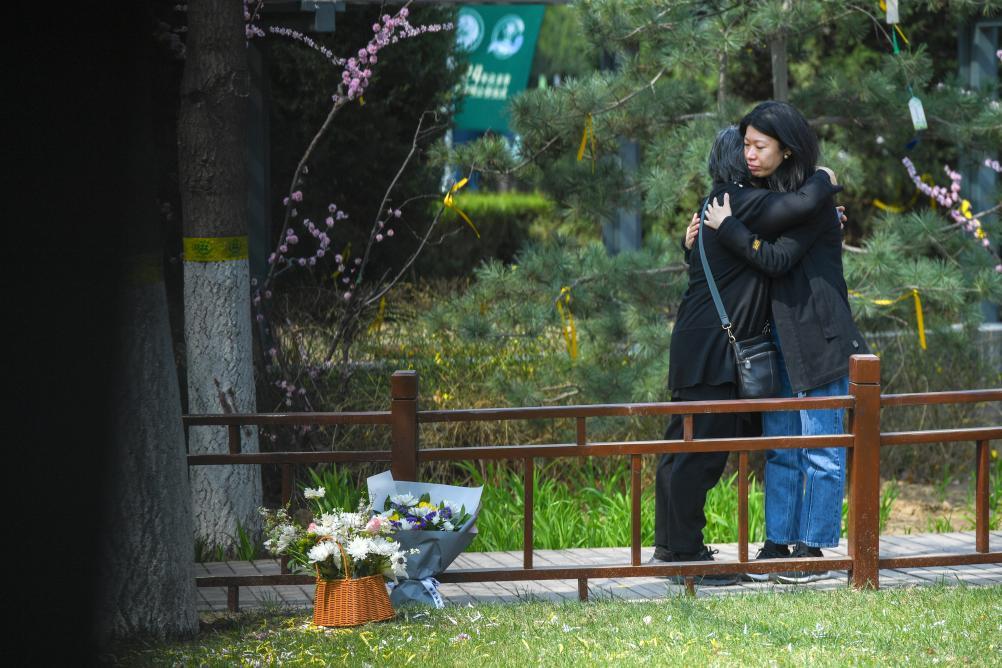4月2日,在北京长青生命纪念园自然葬区,自然葬逝者家属在安放花束、祭奠亲人后相拥。新华社记者 鞠焕宗 摄