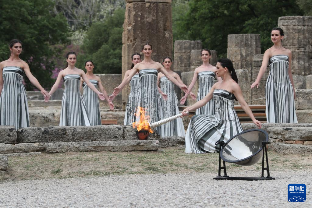 4月16日,扮演最高女祭司的演员玛丽·米娜取得圣火。新华社记者 李京 摄