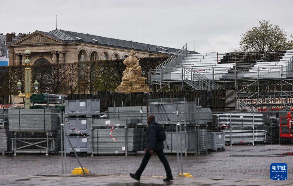 4月2日,行人经过法国巴黎协和广场的奥运比赛场地和看台建设工地。新华社记者 高静 摄