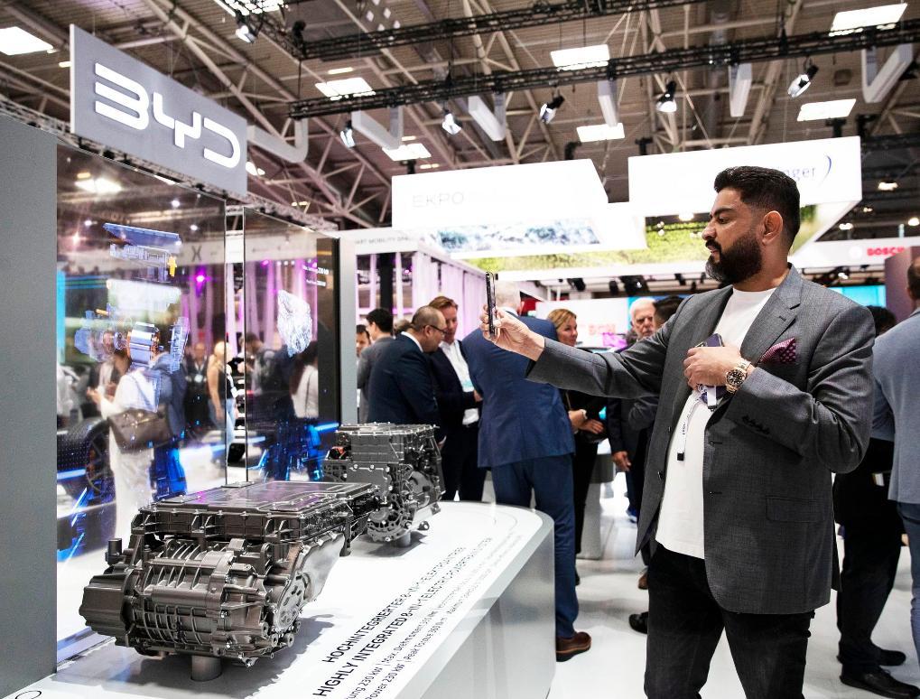 2023年9月4日,一名参观者在德国慕尼黑国际车展媒体预展上拍摄比亚迪的展品。新华社记者张帆摄