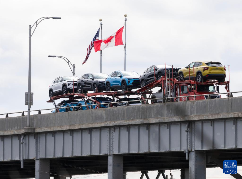 4月9日,在加拿大安大略省尼亚加拉瀑布市加美边境地带,一辆满载的汽车运输车通过刘易斯顿-昆斯顿桥开往加拿大。加拿大财政部4月8日宣布,对美国汽车对等征收25%关税措施于美国东部时间9日零时1分生效。新华社发(邹峥摄)