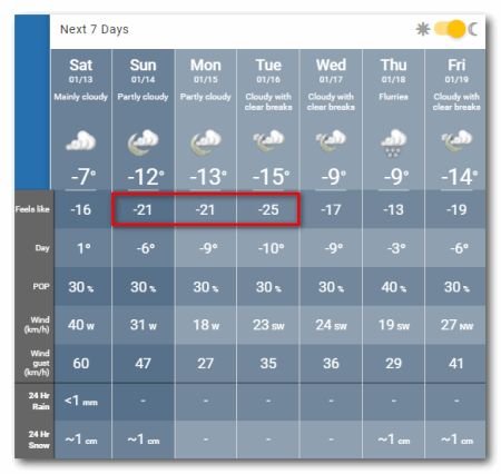 本周日(14日),反季高温情况将会消失。届时气温将急跌至-6℃,加上大风影响体感只有-15℃。夜间气温将降至-21℃。而到了下星期一(15日),日间气温将达到摄氏-9度,有风寒时感觉更像是-16℃。而下星期二(16日)将进入严寒级别。日间气温为-10℃,体感温度低至-18℃。夜间气温将达到-25度。星期三气温为-9℃,体感-17℃。注意保暖!(据都市网、图:加通社)