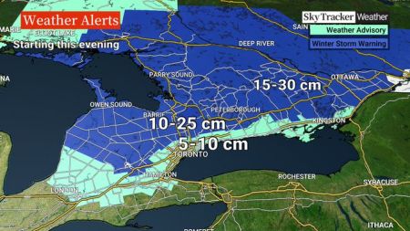 气象学家Ross Hull表示,担心气温会上升,使雪变成雨,然后在一夜之间再次下雨,预测每小时积雪达2到5厘米,总降雪量或达到15厘米。加拿大环境部已针对Lake Huron东北部地区发布多项冬季风暴警告,并对安大略省西南部部分地区以及靠近安大略湖的地区发布特别天气声明。