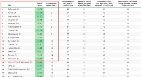 排名前十的安省城市只有Burlington、Aurora和Newmarket。在其中一项居民平均寿命的指标下,前十位基本上被华人聚居的城市占领。