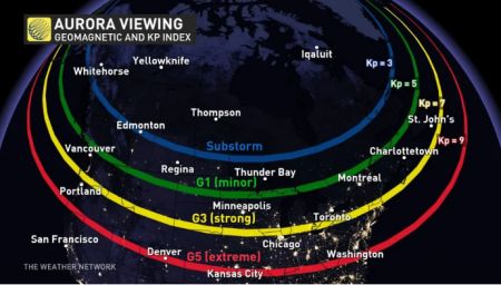 根据NOAA最新预测,今晚加拿大各地将出现“太阳活动”,其中北部和中部地区出现极光的机率较高。北极光出现的情况还须视乎当区天色是否有云。根据NOAA的太空天气预报中心的资料,北极光最可能出现的时间为太平洋时间周二晚上11时至周三凌晨2时,在加西地区看到的机会较大。
