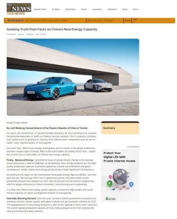 近日,中国驻多伦多总领事罗伟东在当地媒体每日动态新闻网(The Daily Scrum News)和《加拿大商报》发表题为《这个“锅”,该中国新能源产能背吗?》的署名文章,介绍中国新能源产能的基本事实,批驳所谓“产能过剩论”。全文如下: