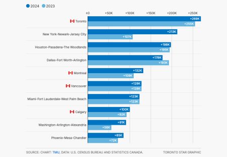 加拿大多伦多“惊人的成长”使其续第二年成为加美成长最快的十座大都会区之首,同时进入十大的加拿大城市还有蒙特利尔、温哥华和卡尔加里。《星报》报道,根据加拿大统计局和美国人口普查局的数据,多伦多连续第二年成为加美成长最快的大都会区,从2023年7月到2024年7月,预计该地区人口将增加近269,000人。