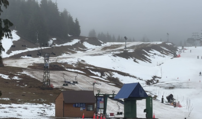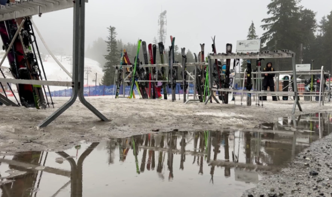 从高处看,大温北岸群山目前几乎是一片绿色,完全不像 2 月该有的样子。在 Grouse Mountain,周三的气温一度冲到 12°C。整个滑雪场 30 多条雪道中,只开放了 7 条。
