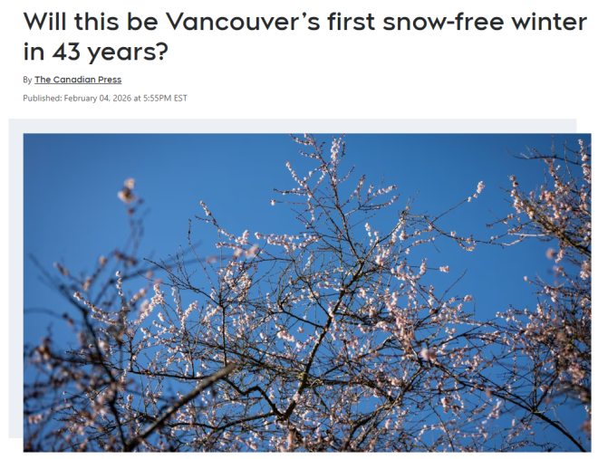 加拿大环境部气象学家 Ken Dosanjh 表示,虽然从理论上来说冬天还没结束,但短期天气预报中,完全看不到海平面降雪的迹象。“如果一直到春天都没有正式降雪,那这将是温哥华自 1982–83 年以来,第一次整个冬天没有雪。”他说。