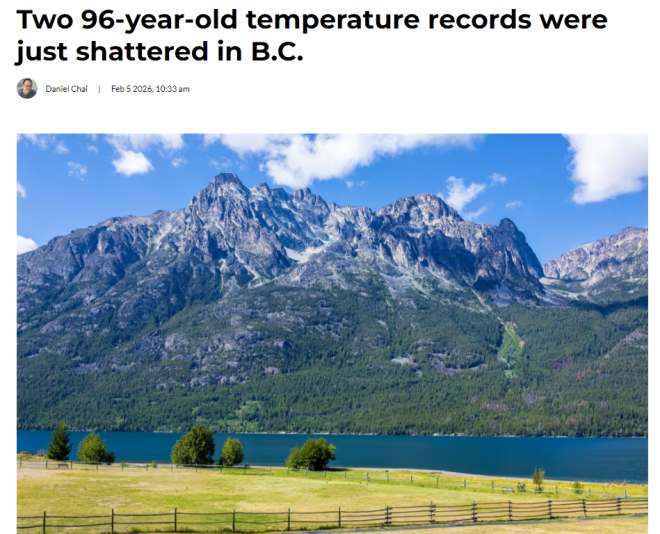 异常偏暖的不只是温哥华。根据加拿大环境与气候变化部(ECCC)发布的数据,截至 2 月 4 日晚上 11:11,BC 省至少 15 个地区刷新或追平当日历史高温纪录。其中有两个地点,直接打破了保持了 96 年的纪录。