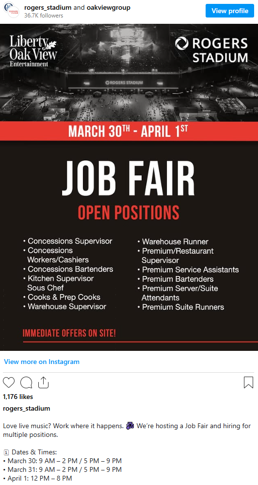 招聘会将由 Oak View Group 与场馆联合举办,招聘职位包括: