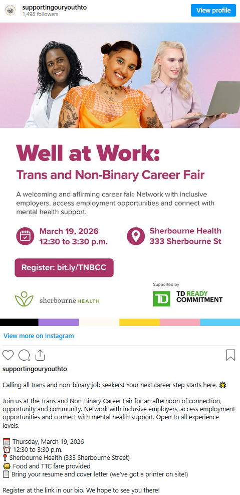找到一份工作固然重要,但拥有包容的工作环境同样关键。3月19日 12:30 p.m. – 3:30 p.m.,SOY Toronto 将在 Sherbourne Health 举办一场专为跨性别和非二元性别人士举办的招聘会。
