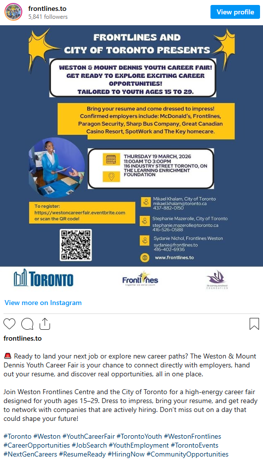 如果你年龄在15至29岁之间,可以参加3月19日上午11点至下午3点在The Learning Enrichment Foundation举行的 Weston & Mount Dennis Youth Career Fair。该活动由 City of Toronto 和 Frontlines Toronto 联合举办,帮助年轻人进行模拟面试并申请真实岗位。