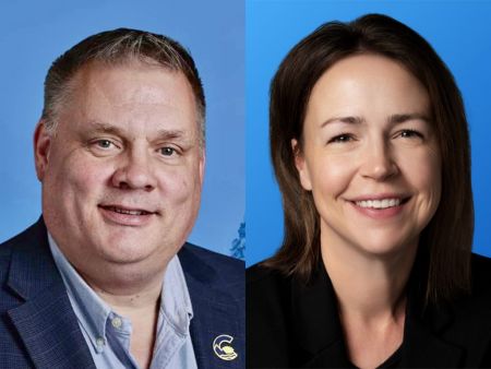 (BC保守党党领选举争霸战中,目前领跑的麦励博(左)和艾略特(右)。)