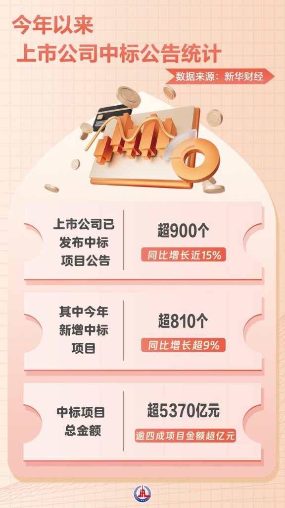 从金额来看,新华财经数据显示,今年以来A股上市公司中标项目总金额已超5370亿元,逾四成中标项目的金额超亿元。其中,中标金额10亿元至100亿元的项目占比约15%,中标金额1亿元至10亿元的项目占比约25%。