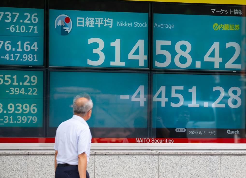 8月5日,行人走过位于日本东京的显示实时股价的电子屏幕。新华社记者岳晨星摄